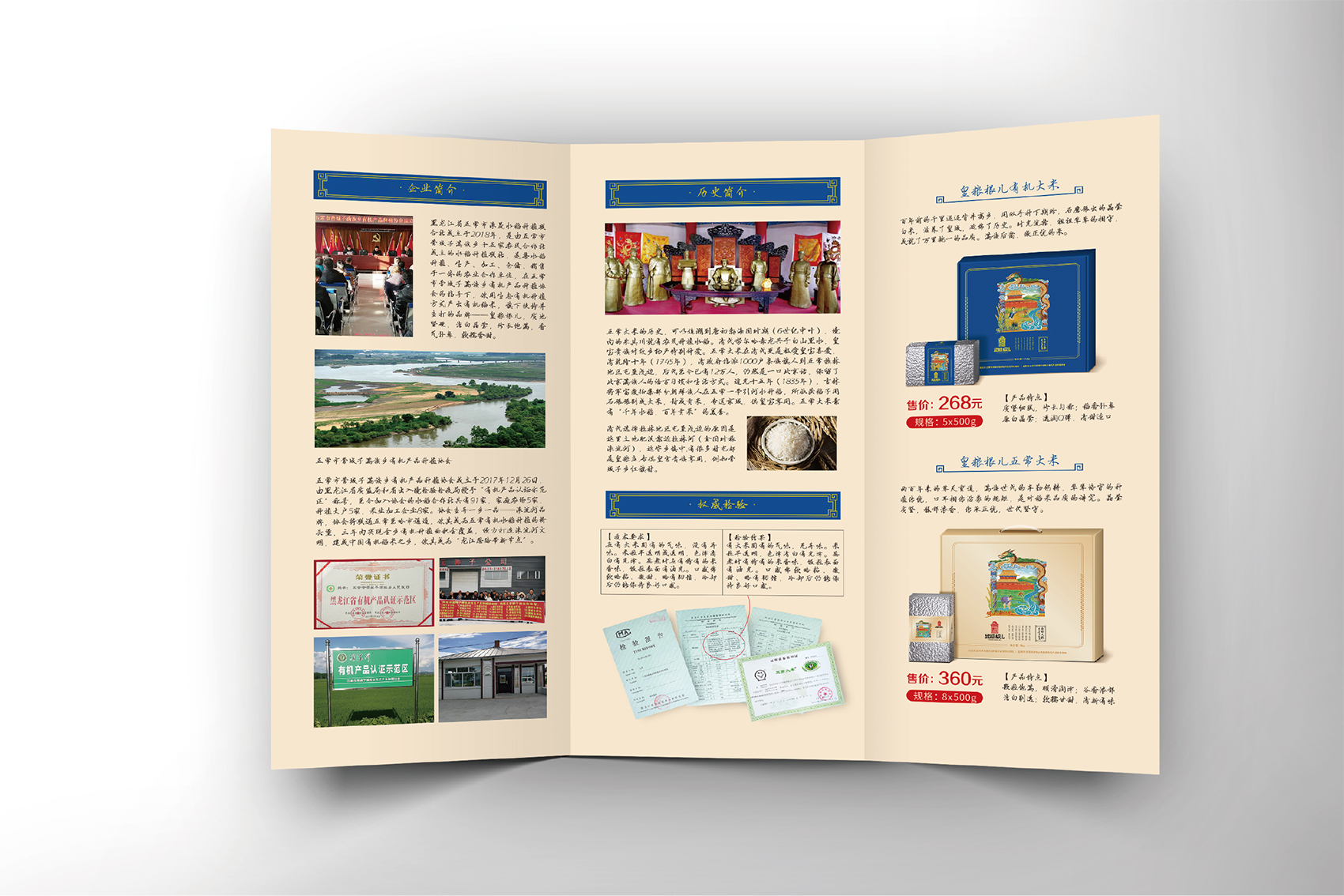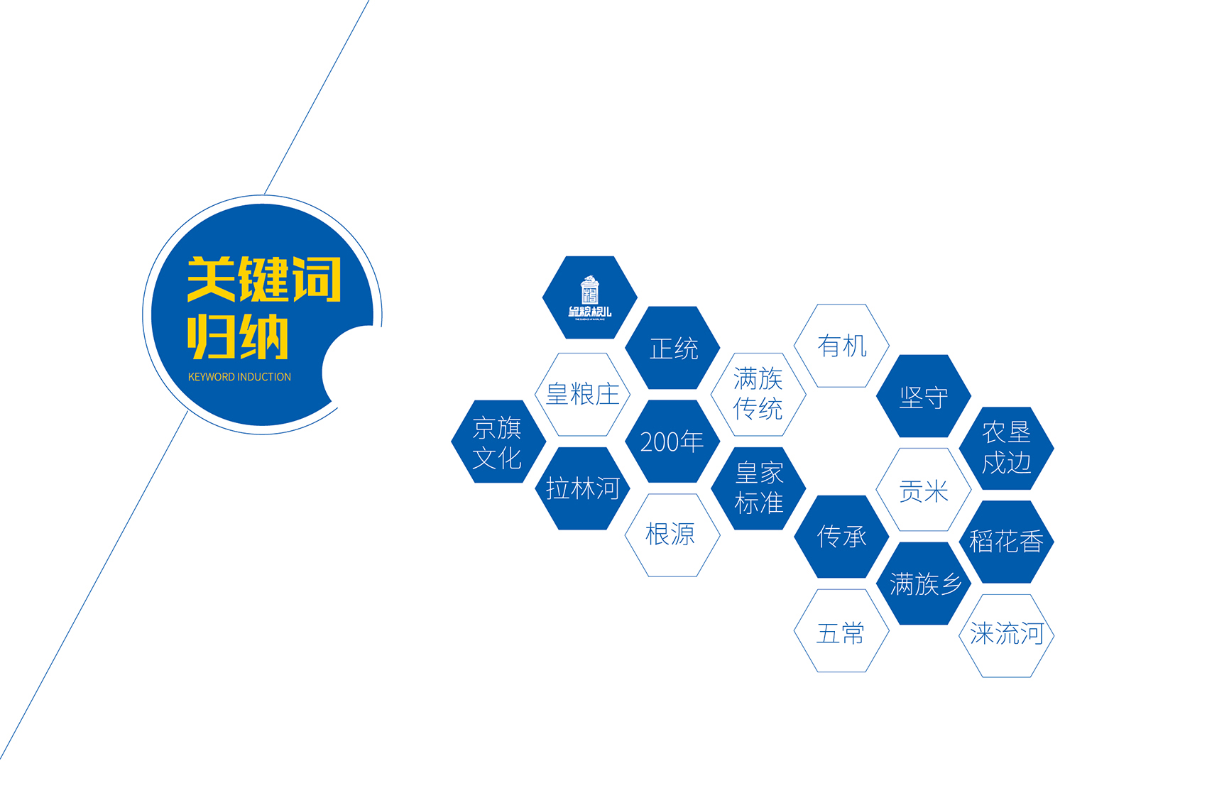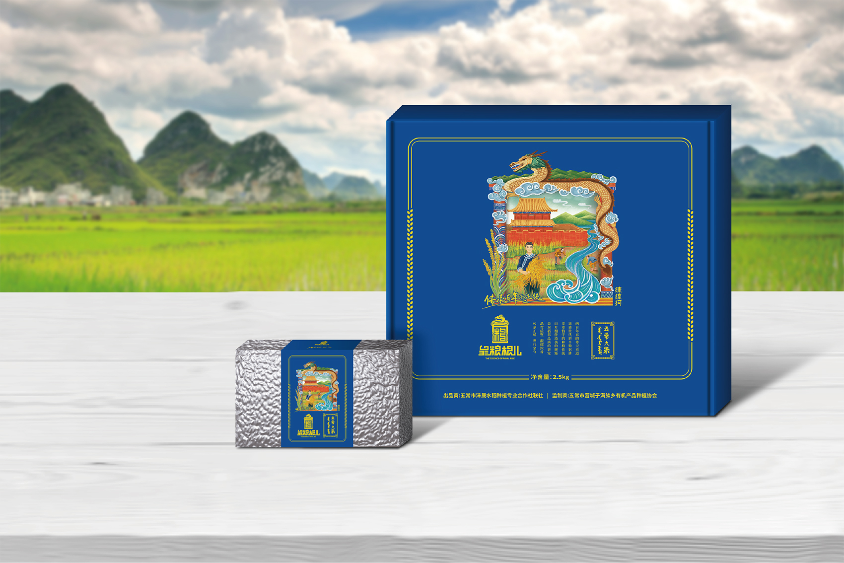 針對皇糧根兒大米中的高端產(chǎn)品——有機大米,繽策團隊在進行市場調(diào)研,查閱大量資料后發(fā)現(xiàn)電商市場中有機產(chǎn)品包裝多數(shù)以紅色與綠色為主,紅色對于中國民族具有獨有的心理印記,代表著吉祥喜慶,節(jié)日的歡樂,綠色則代表自然與生態(tài),在視覺層面上大多數(shù)都趨于同化,無法留下獨特的品牌印象。在確定品牌文化后,在延續(xù)傳承滿族百年正統(tǒng)貢米的主題下,繽策團隊在如何表現(xiàn)滿族傳統(tǒng)方面進行了大量的資料收集整理與研究,發(fā)現(xiàn)代表滿族皇室的顏色正是有機大米品類中幾乎沒有的藍色,這種差異化的顏色本身就能夠起到超級符號的作用;在內(nèi)容方面則選取了與品牌logo相同結構的龍與皇城組合而成的元素,一方面呼應logo,另一方面不斷加強皇糧根兒的品牌印象,形成聯(lián)動效應。