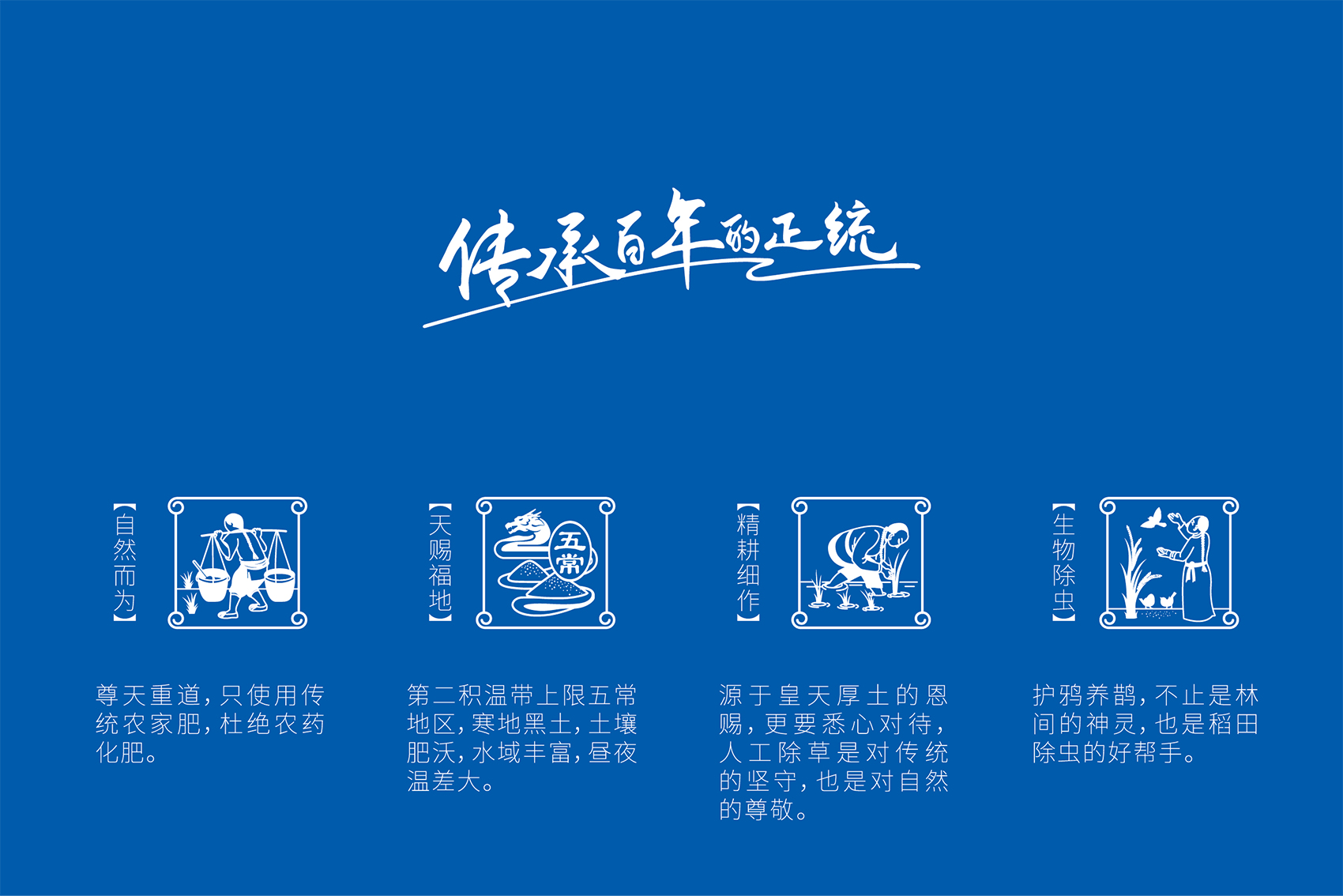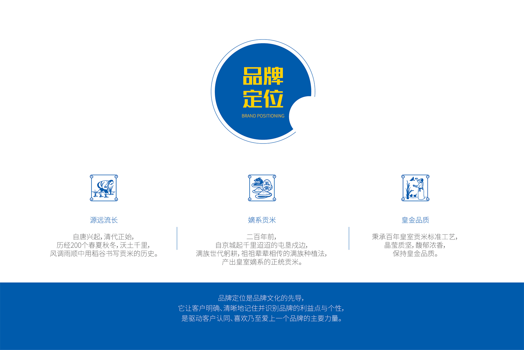 作為品牌的核心競爭力,品牌文化需要彰顯產(chǎn)品自身的特點和與眾不同的差異化存在,結合創(chuàng)始人的發(fā)心與愿景,創(chuàng)造出具有獨特價值的文化系統(tǒng)。繽策團隊在與企業(yè)座談中了解到五常市營城子滿族鄉(xiāng)自唐興起,清代正始,歷經(jīng)200個春夏秋冬,世代種植貢米的悠久歷史,是品牌所具備的獨一無二的天然優(yōu)勢,同時也是產(chǎn)品品質(zhì)值得信賴的根源所在。這使得皇糧根兒有機大米采用滿族傳統(tǒng)種植方式,進行有機種植,杜絕農(nóng)藥化肥,傳統(tǒng)的生物除蟲人工除草,精耕細作保證產(chǎn)品品質(zhì)。這也成為了皇糧根兒品牌文化的出發(fā)點與落腳點。