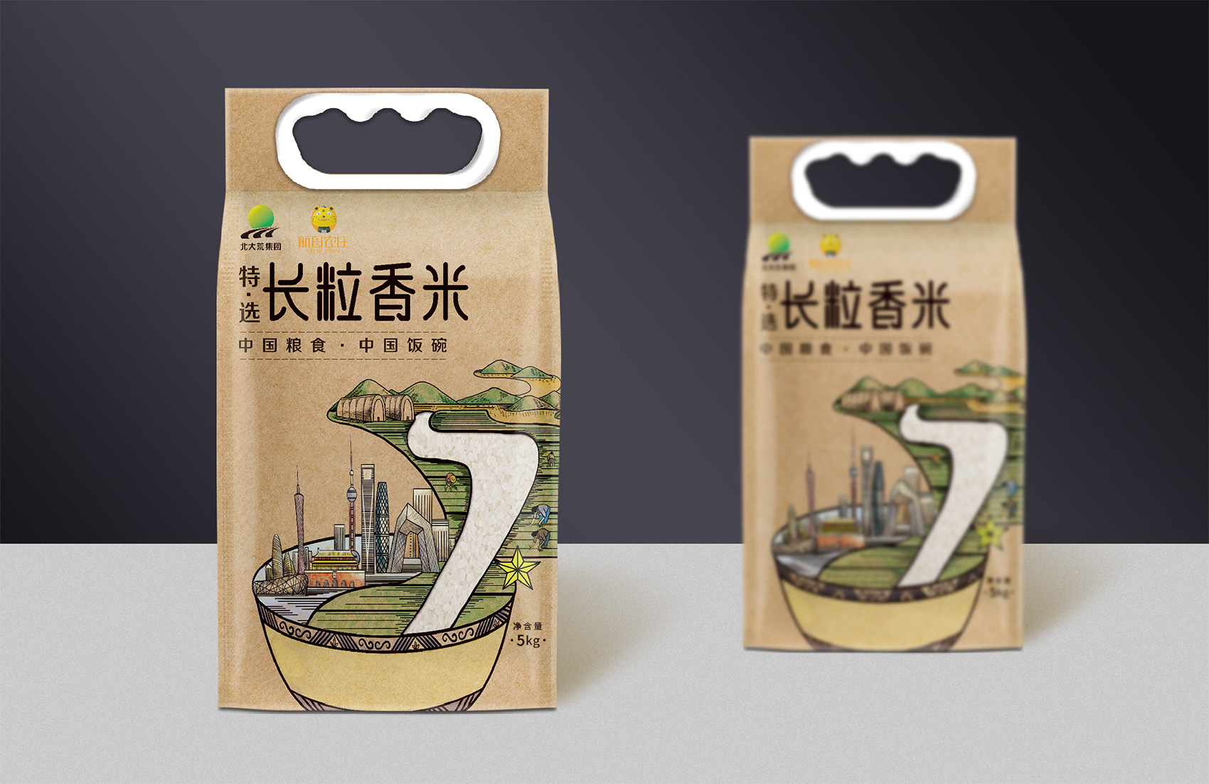 長粒香種植區(qū)位于七星農場,在習近平總書記考察后發(fā)表了著名的中國飯碗中國糧的講話,“北大荒為中國人真正解決溫飽問題發(fā)揮了大作用,我們一定要保護好黑土地,保護好中國飯碗。中國人要把飯碗端在自己手里,而且要裝自己的糧食?!崩_策采用類版畫風格的插畫來表現(xiàn)從農場直接到飯碗中的品牌核心價值,優(yōu)質的綠水青山自然環(huán)境之下生產出高品質好滋味的長粒香,中間的鏤空部分既象征著產品的產地——七星農場,也象征著運送產品的廣闊道路,形成令人記憶深刻的超級符號;在碗中的地標性建筑物代表全國各地,寓意企業(yè)寬廣美好的未來;整體包材采用環(huán)保牛皮紙,在提升了質感與手感的同時,也能在同質化的包裝中脫穎而出。