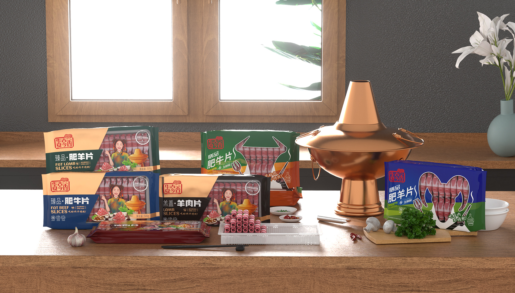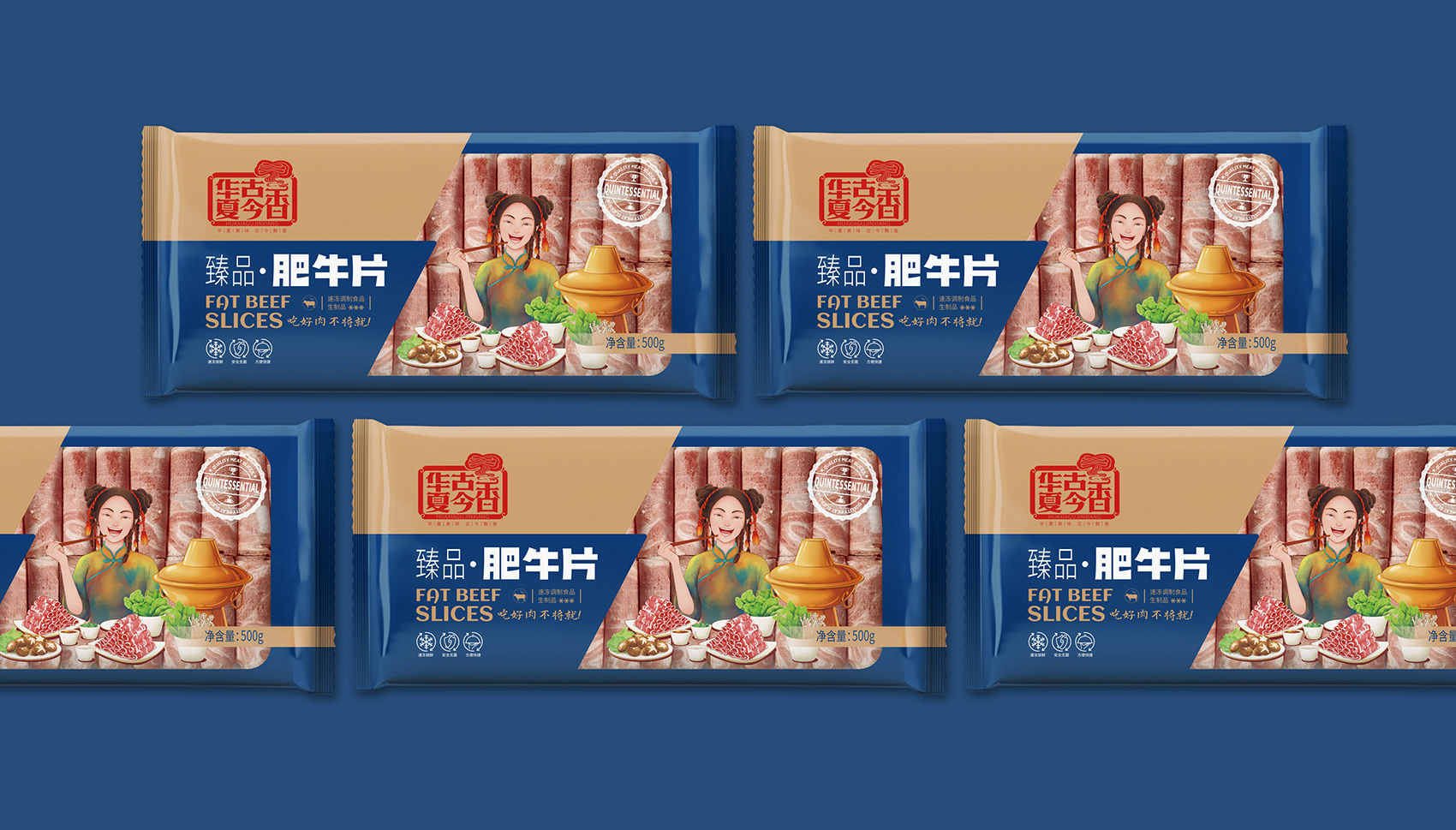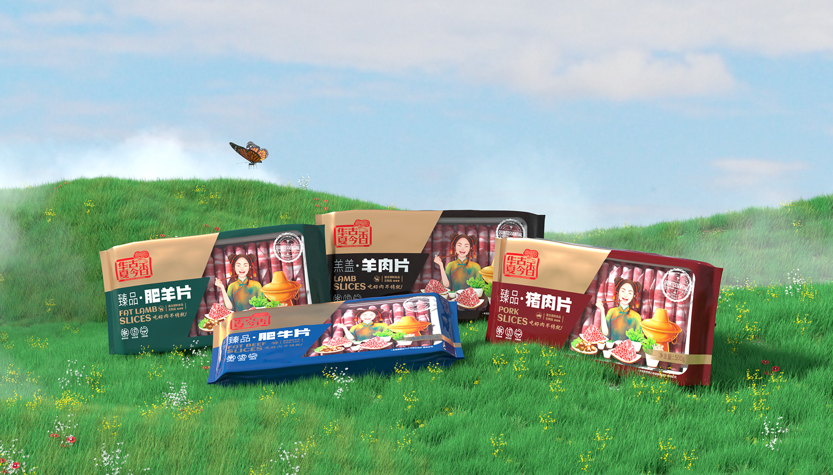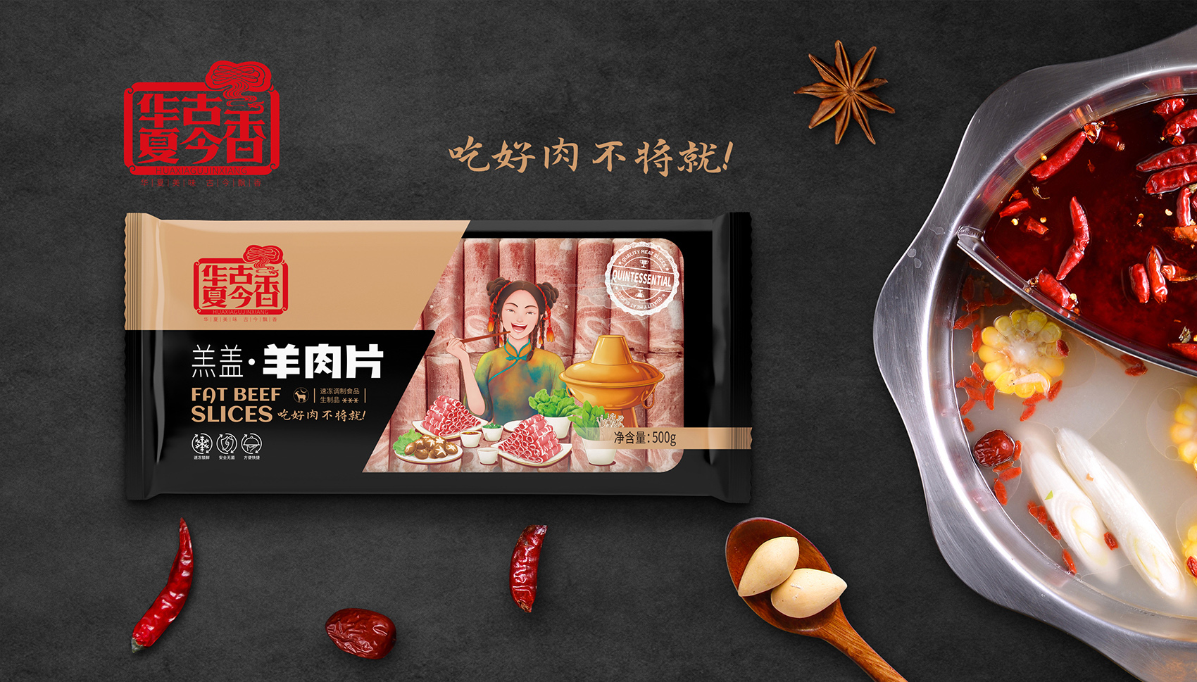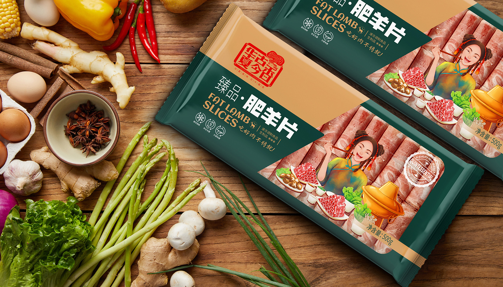 通過大量市場調(diào)研,多輪頭腦風(fēng)暴的研討,繽策將消費場景與品類相結(jié)合打造出品牌專屬符號,在中低端品類中以手持刀叉的羊頭剪影形式展現(xiàn),點明品類同時預(yù)示肉片的品質(zhì)上乘,簡潔明了,便于推廣傳播;在高端品類中以寫實厚涂風(fēng)格插畫描繪出食用場景,選取產(chǎn)品與消費者重疊的場景,將“吃好肉,不將就”的品牌承諾生動形象的呈現(xiàn)出來,在與其他競品相互區(qū)別的同時,能夠最大化凸顯品牌的核心價值——好肉。