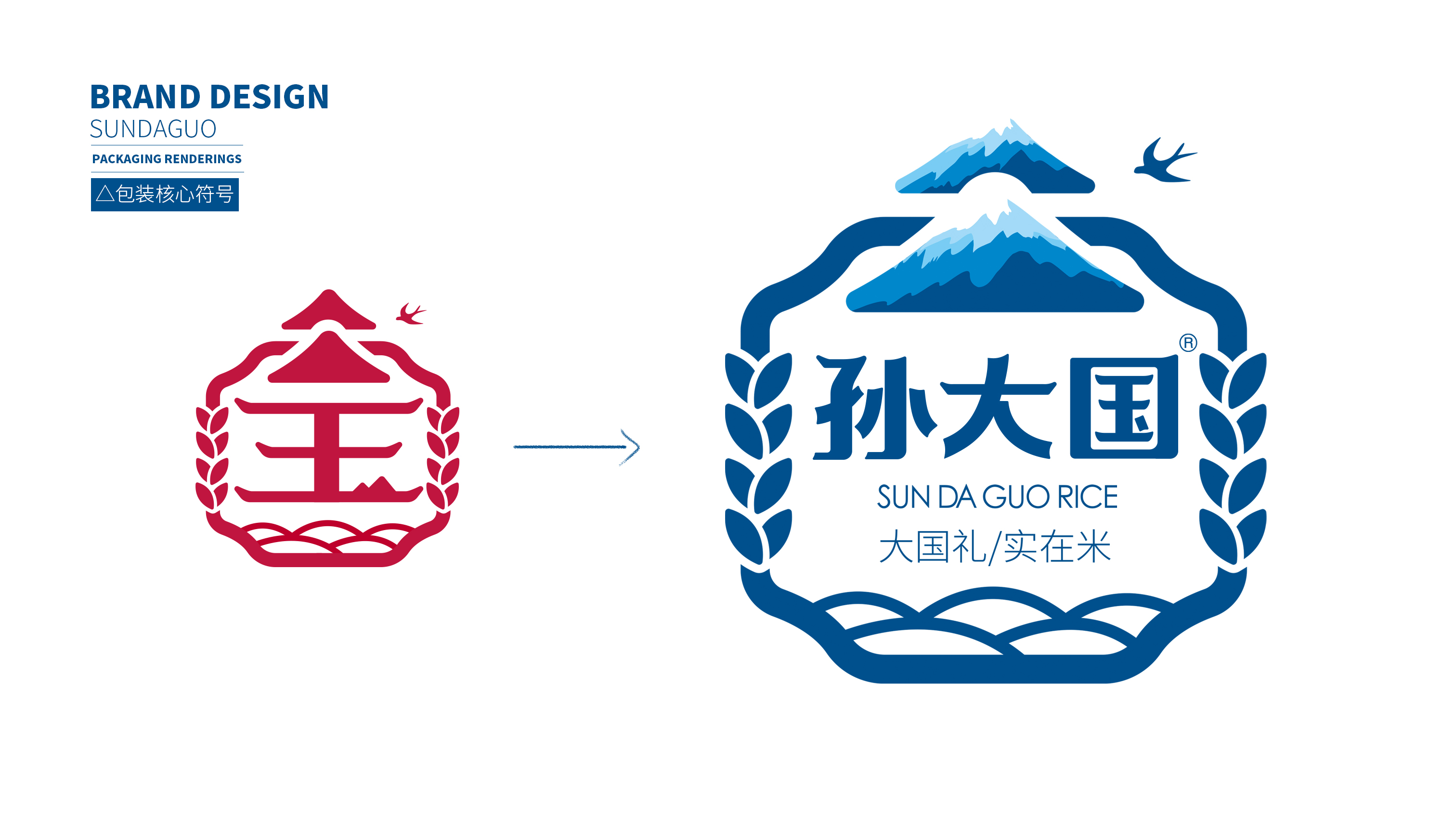 所以有品牌的最終目的都是為了讓消費(fèi)者在需要時(shí)第一想到它,進(jìn)而進(jìn)行消費(fèi),所以達(dá)成現(xiàn)任的第一步是識(shí)別和記憶,品牌名稱是消費(fèi)者需要記住的核心概念,所以繽策從孫大國這個(gè)品牌名稱下手,提煉了國這個(gè)自帶流量且更容易記憶的字,并創(chuàng)造了一條自帶營銷屬性的廣告語——“大國禮,實(shí)在米”,大國禮的定義首先將品牌與其他同類競(jìng)品拉開了距離,暗示品牌是國禮級(jí)別的品質(zhì),而實(shí)在米則是針對(duì)偏重價(jià)格性價(jià)比的消費(fèi)人群量身打造,在告訴打擊是童叟無欺的好大米和品牌踏實(shí)做事的態(tài)度。并在此的核心概念下折了logo,融入行業(yè)屬性的同時(shí)借助傳統(tǒng)文化將其打造的既熟悉又新穎;包裝方面延續(xù)logo形式,以超級(jí)符號(hào)的形式將品牌最大的視覺化呈現(xiàn)在包裝上,在不斷的突出與重復(fù)之中將品牌融入消費(fèi)者心智中,并與之建立長久的聯(lián)系,以最高效的傳播力與和諧之感在同類競(jìng)品中脫穎而出,幫助企業(yè)順利進(jìn)入消費(fèi)市場(chǎng)。