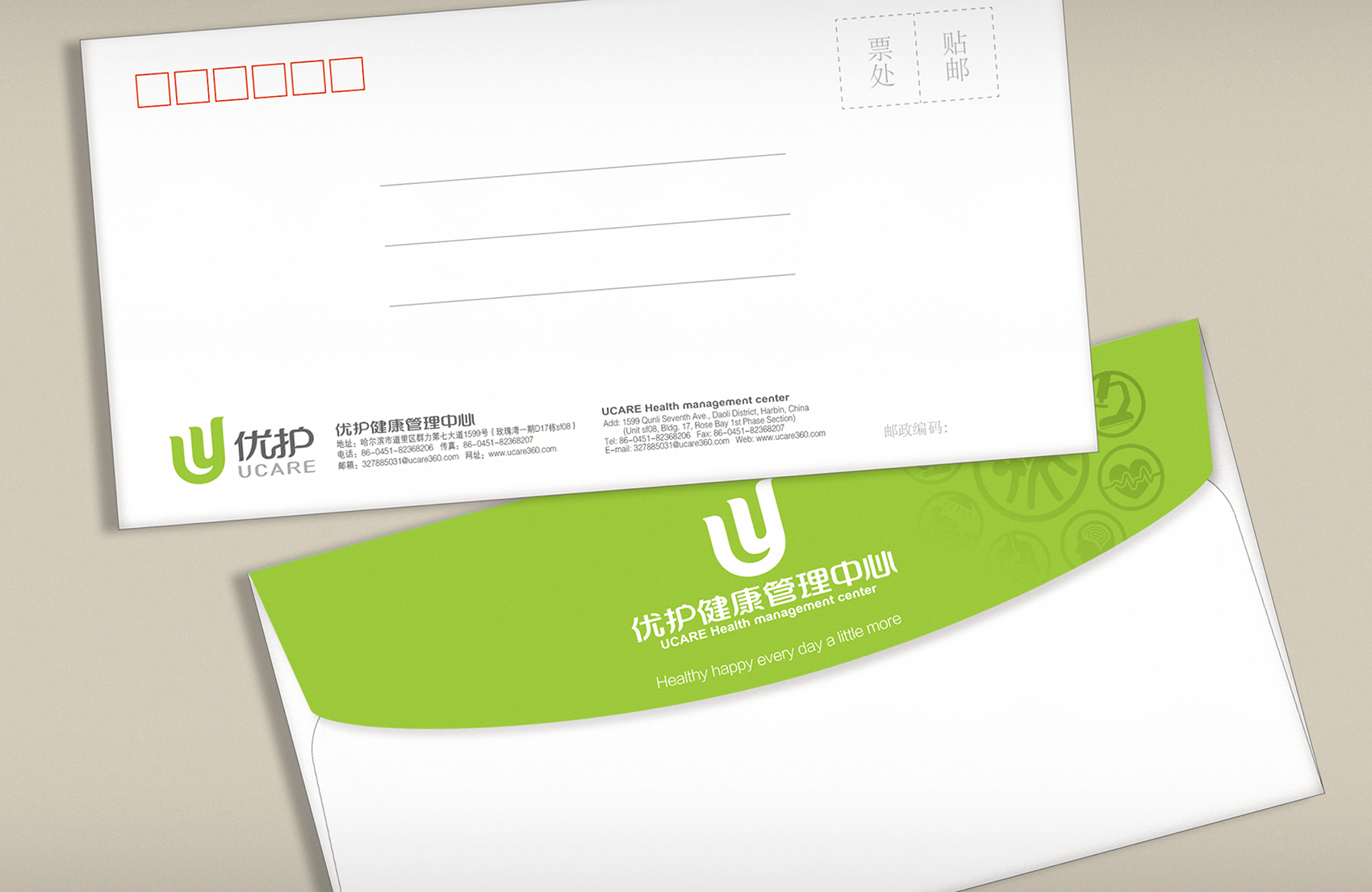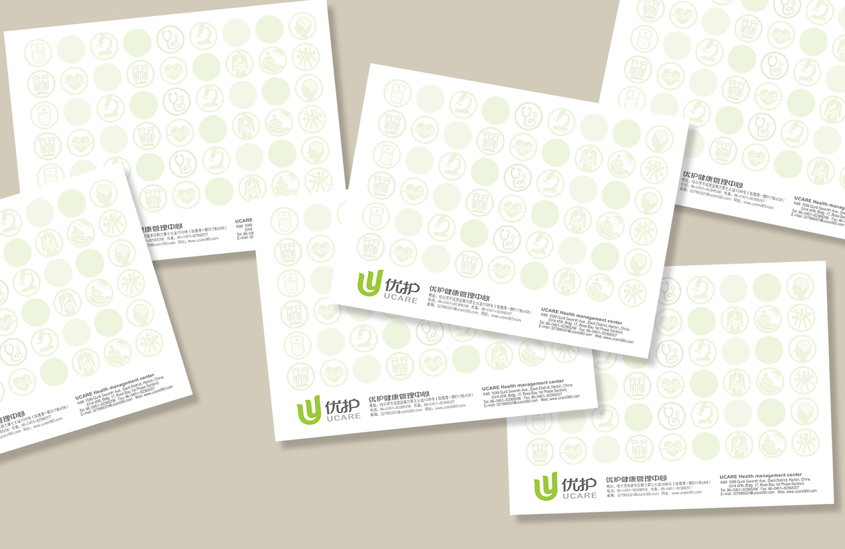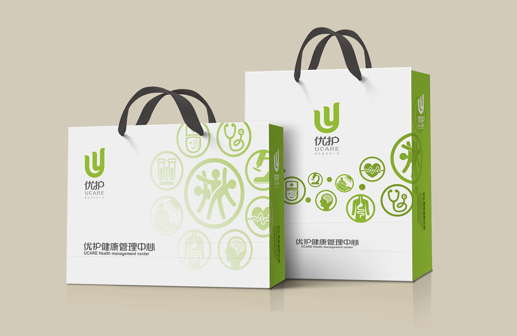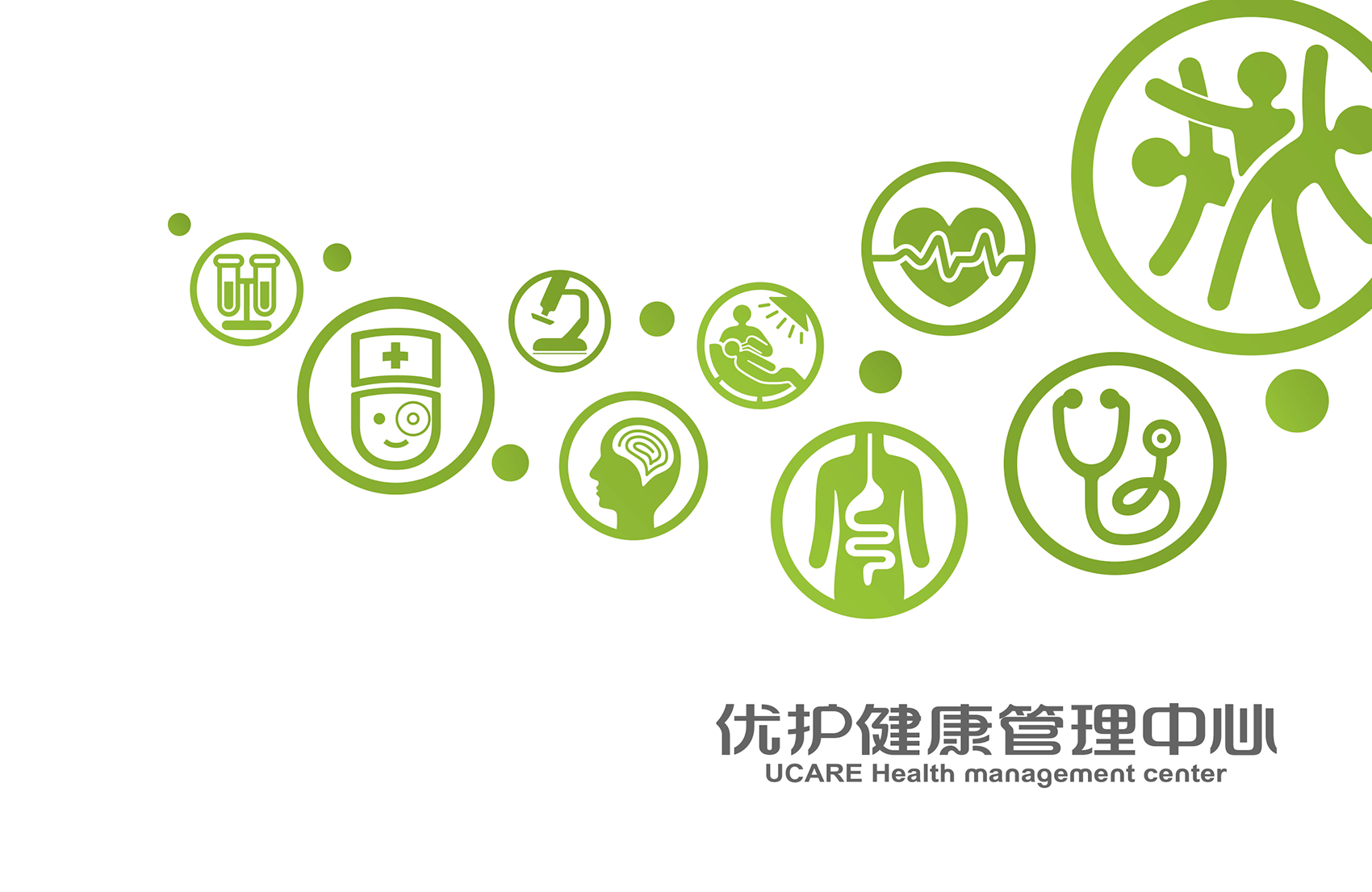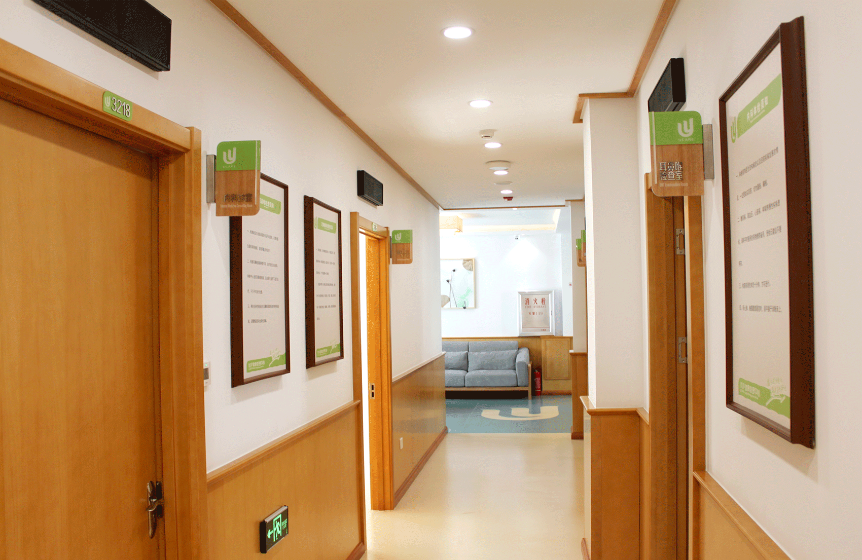 選用同色系的嫩綠作為主色調(diào),一方面凸顯出健康管理中心與優(yōu)護醫(yī)院的關(guān)聯(lián)性,另一方面在視覺上能夠直接了當?shù)姆直娑邊^(qū)別,嫩綠色代表了新生與希望,表達了消費者在健康管理中的人性化關(guān)懷服務(wù)中獲得嶄新的健康狀態(tài)和生活樂趣,將品牌氣質(zhì)與品牌精神通過環(huán)境表達的淋漓盡致。
