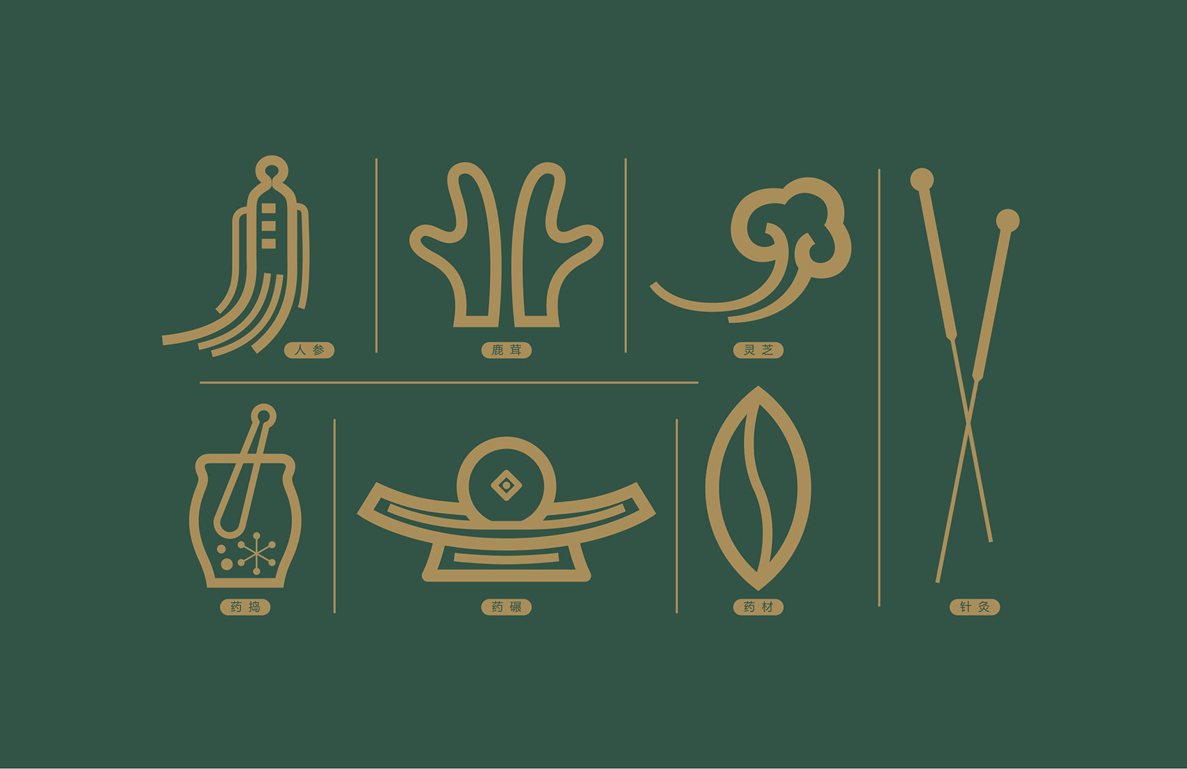 至于品牌輔助圖形,繽策規(guī)劃出靈芝、銀針、藥杵等七種中醫(yī)領(lǐng)域最常見(jiàn)、最具代表性的物品,加之品牌形象共計(jì)八種形態(tài),以暗合八卦的一一對(duì)應(yīng)。