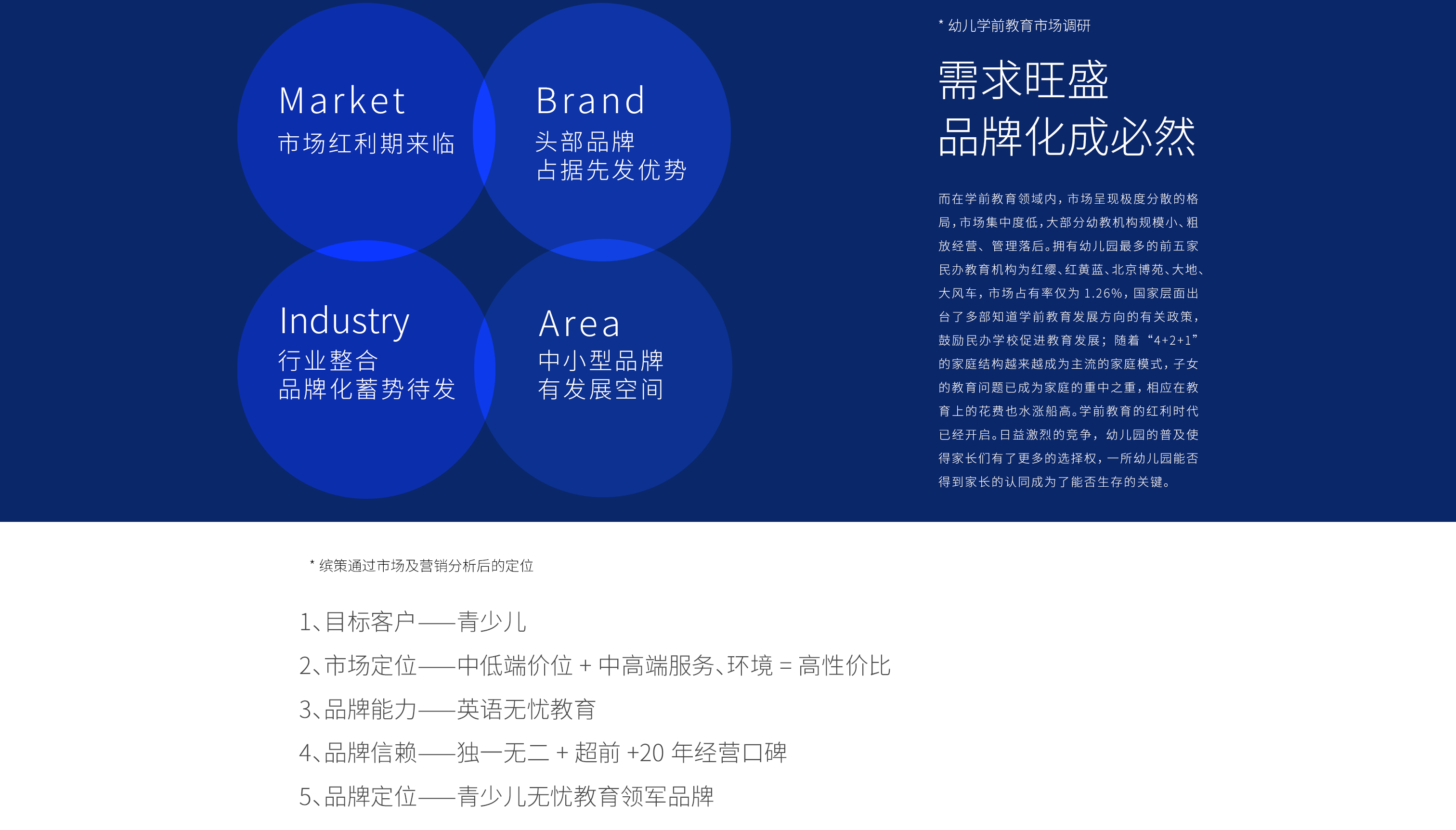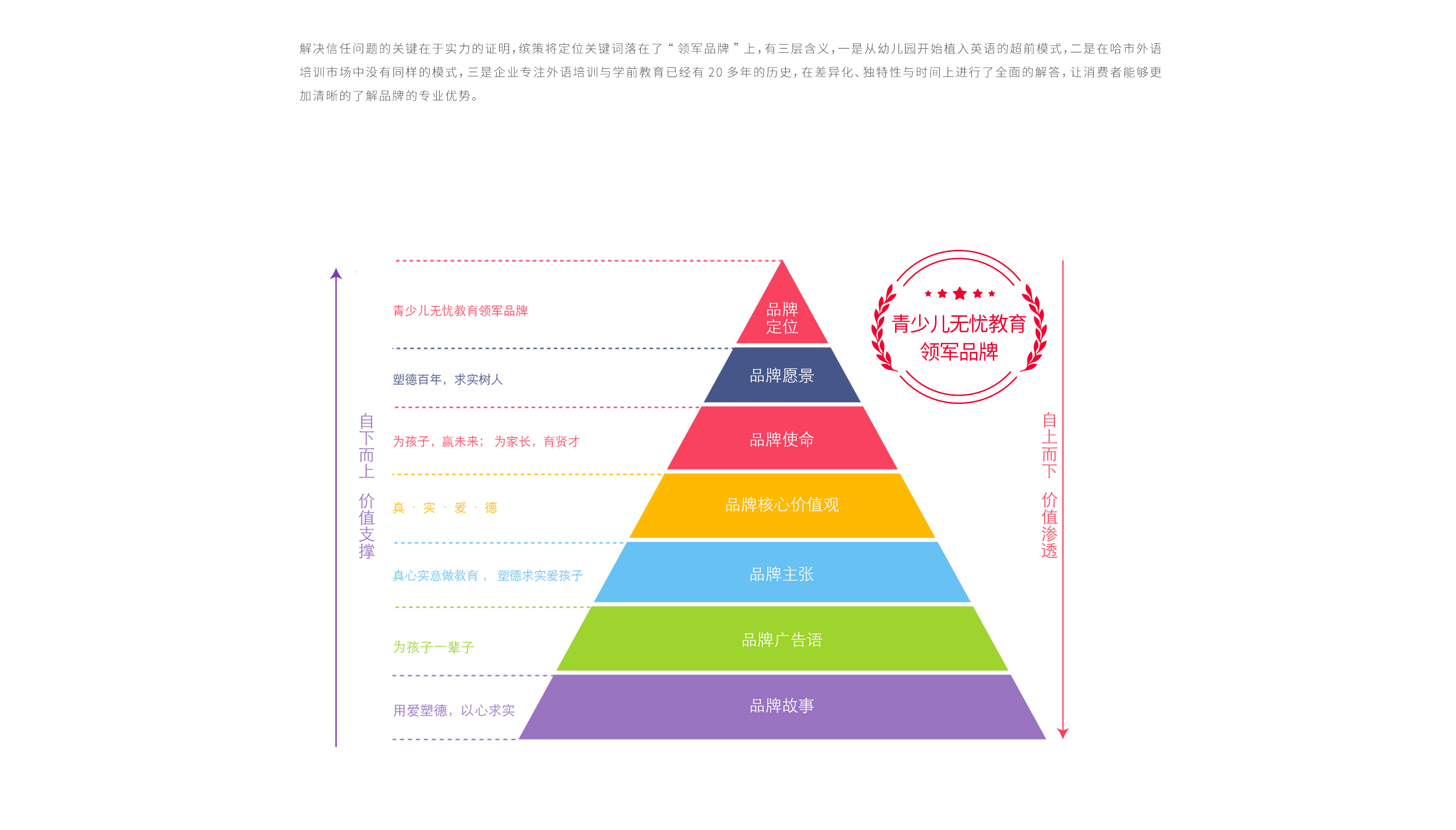 教育行業(yè)屬于剛需市場,貫穿著從學(xué)齡前至本科及以上,其重要性不言而喻,而其特殊性在于消費決策者與消費體驗者的錯位,即選擇教育品牌的往往是家長,而上課的則是孩子,所以教育品牌面對的是家長與孩子作為整體家庭的消費者,塑徳求實的產(chǎn)品線涇渭分明的同時,又有其關(guān)聯(lián),在體驗完幼兒園產(chǎn)品線的消費者往往也同樣會繼續(xù)選擇英語產(chǎn)品線,所以在定位上既要概括這兩種不同的目標(biāo)客群,同時也要明確企業(yè)的優(yōu)勢項目——少兒教育,并在品牌文化中融入獨特性——塑徳求實對于孩子們的愛,經(jīng)過二十余家競品市場調(diào)研以及多次座談,繽策以青少兒無憂教育為定位,將愛孩子一輩子的品牌核心構(gòu)筑整體文化,以標(biāo)志性費老師個人IP為超級符號,全面建設(shè)塑徳求實品牌。